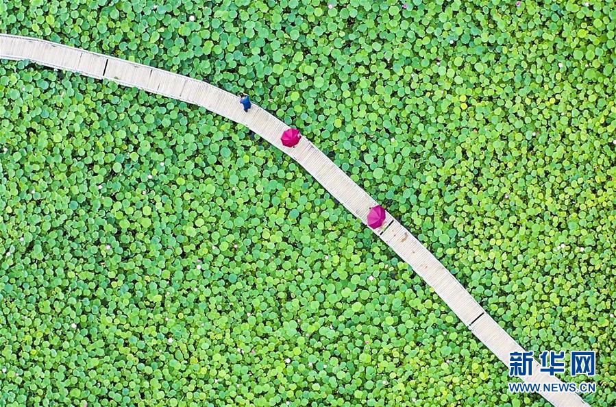 8月6日,游客在河北省永清縣里瀾城鎮(zhèn)金華湖觀賞荷花(無(wú)人機(jī)照片)。夏日時(shí)節(jié),河北省永清縣里瀾城鎮(zhèn)金華湖荷塘的荷花爭(zhēng)相開放,吸引市民和游客前來游玩觀賞。新華社記者李曉果攝