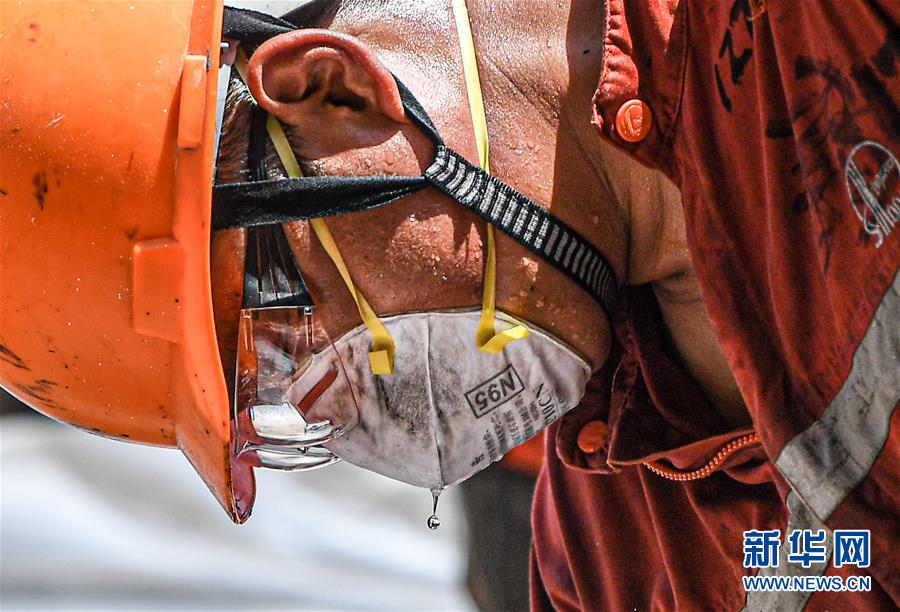 7月27日,在位于南海北部海域的勘探三號(hào)鉆井平臺(tái)上,一名鉆井工人在作業(yè)時(shí)汗水浸透了口罩。新華社記者蒲曉旭攝