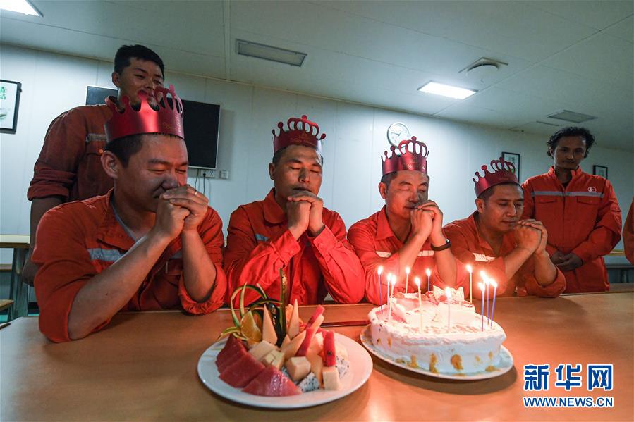 7月22日,在位于南海北部海域的勘探三號(hào)鉆井平臺(tái)上,4名鉆井工人在平臺(tái)餐廳里過(guò)集體生日。新華社記者蒲曉旭攝