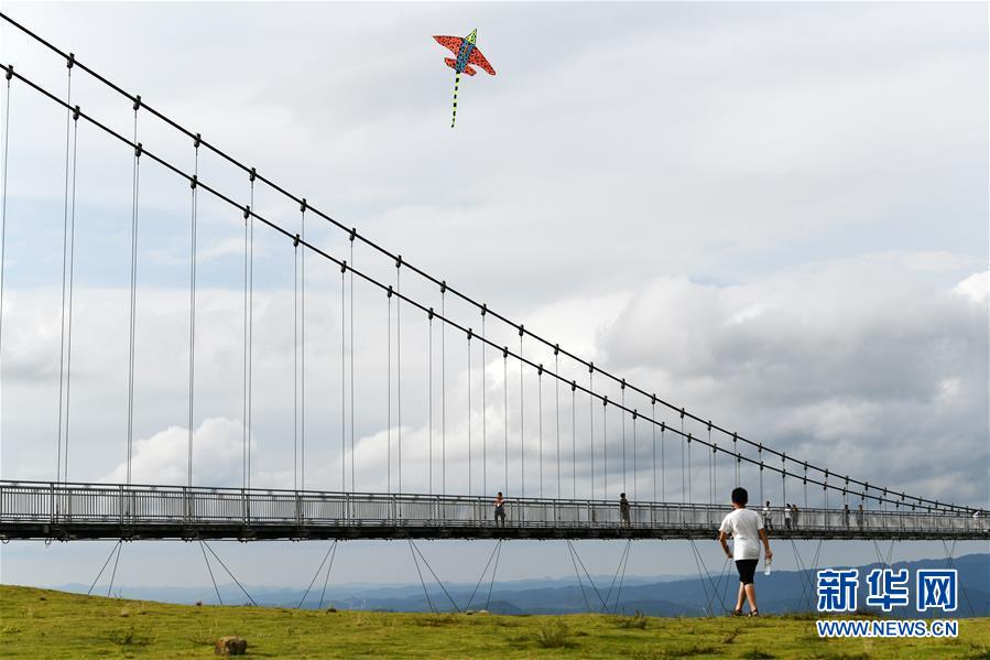 8月8日,游客在貴州省龍里油畫大草原的吊橋上觀光。近日,貴州省黔南布依族苗族自治州龍里縣境內(nèi)氣候宜人,龍里油畫大草原、“龍門鎮(zhèn)”武俠文化主題景區(qū)等景點(diǎn)吸引眾多游客前來觀光旅游。新華社記者楊文斌攝。