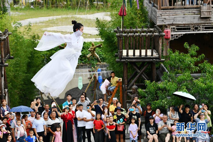 8月8日,游客在貴州省龍里縣“龍門鎮(zhèn)”武俠文化主題景區(qū)觀看武俠劇表演。近日,貴州省黔南布依族苗族自治州龍里縣境內氣候宜人,龍里油畫大草原、“龍門鎮(zhèn)”武俠文化主題景區(qū)等景點吸引眾多游客前來觀光旅游。新華社記者楊文斌攝。