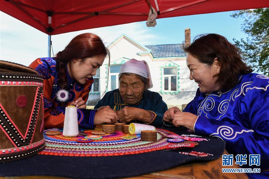 在內(nèi)蒙古自治區(qū)鄂溫克族自治旗伊敏蘇木的老家,艾吉瑪(左)在向姥姥水機(jī)花(中)、母親烏仁(右)學(xué)習(xí)太陽花制作工藝。(8月6日攝)。新華社記者劉磊攝。