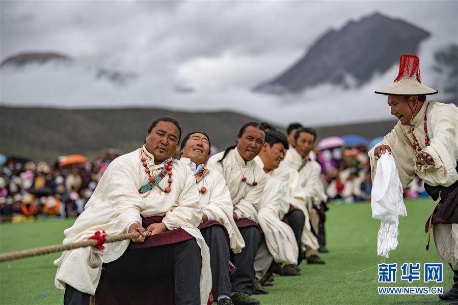 8月10日,當雄縣牧民在拔河比賽中。新華社記者普布扎西攝。