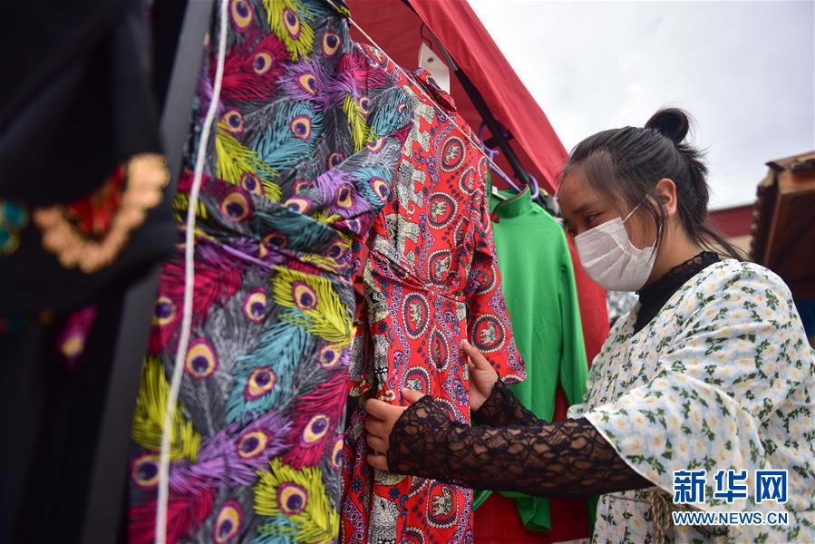 8月11日,尖扎縣昂拉鄉(xiāng)德吉村村民在自家經(jīng)營的藏裝店內(nèi)整理服裝。新華社記者張龍攝