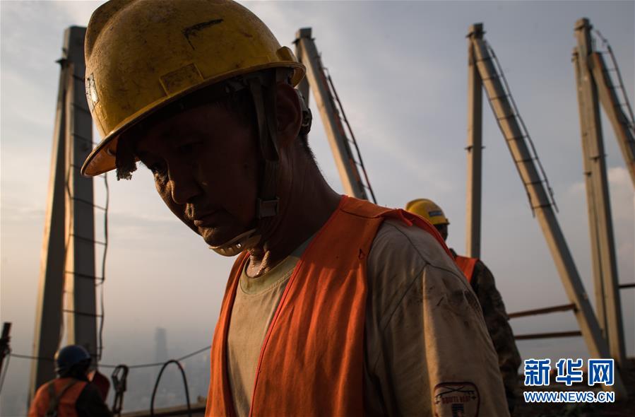 8月11日傍晚,工人在武漢綠地中心項(xiàng)目建設(shè)現(xiàn)場(chǎng)近500米的高空施工。新華社記者肖藝九攝