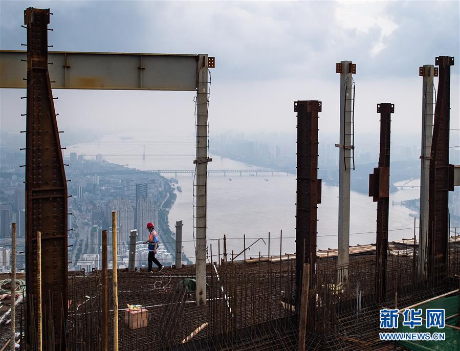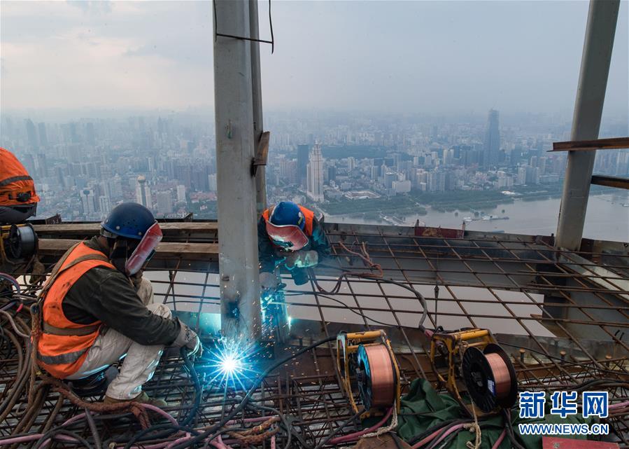 8月11日,工人在武漢綠地中心項(xiàng)目建設(shè)現(xiàn)場(chǎng)近500米的高空施工。新華社記者肖藝九攝