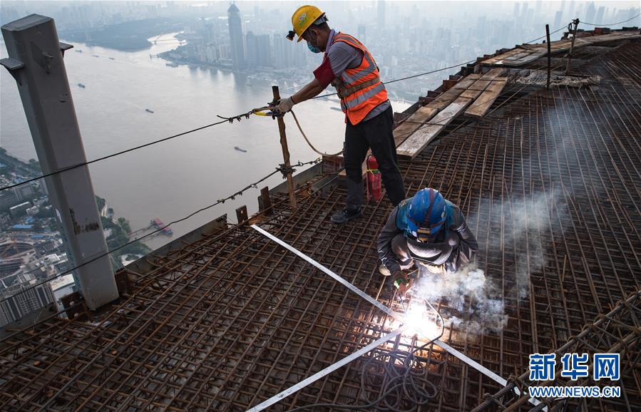 8月11日,在武漢綠地中心項目建設現(xiàn)場近500米的高空,來自中建三局二公司的工人熊明生(右)、張幸紅冒著高溫施工。新華社記者肖藝九攝