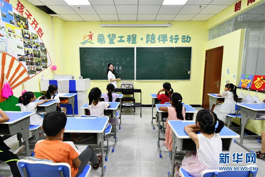 8月13日,在貴州省思南縣雙塘街道麗景社區(qū)易地扶貧搬遷安置點(diǎn),志愿者在給孩子們上音樂課。今年暑假期間,在貴州省銅仁市思南縣雙塘街道麗景社區(qū)易地扶貧搬遷安置點(diǎn),來自北京有研集團(tuán)和思南當(dāng)?shù)氐闹驹刚邆兝檬钇跁r(shí)間,給安置點(diǎn)的孩子們進(jìn)行音樂、體育、手工、安全教育等課程輔導(dǎo),幫助搬遷戶照看孩子,讓孩子們?cè)趯W(xué)習(xí)中度過一個(gè)快樂而有意義的暑假。新華社記者楊文斌攝