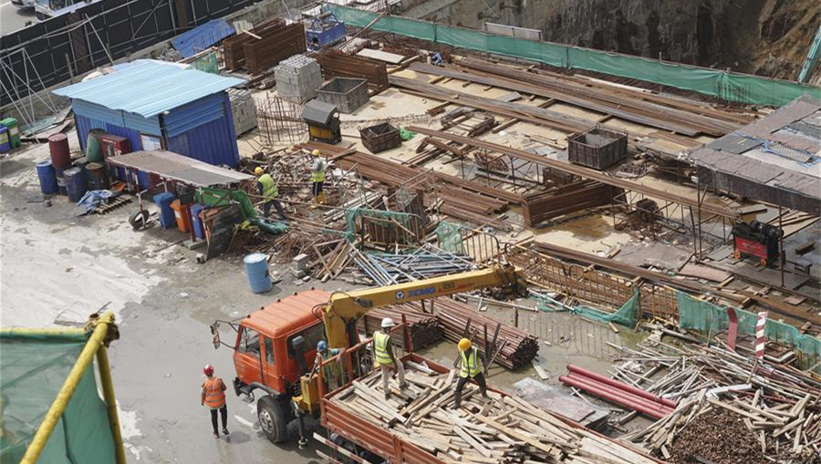 6月21日,在斯里蘭卡首都科倫坡,工人在中國(guó)港灣科倫坡房建項(xiàng)目工地上作業(yè)。