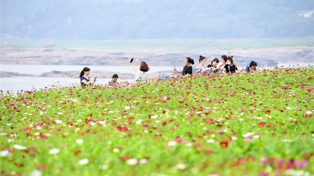 近日,重慶市巴南區(qū)木洞鎮(zhèn)長江岸邊的格?;ǜ傁嚅_放,吸引游客前來賞花觀景。