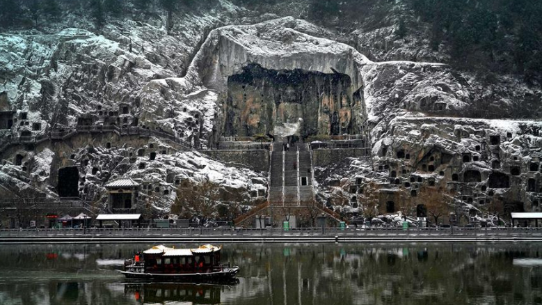 當(dāng)日,雪后的河南洛陽龍門石窟景區(qū)銀裝素裹,一幅天然的水墨畫卷徐徐展開。