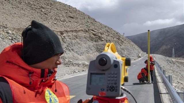 近日,國測一大隊隊員在日喀則市定日縣曲當鄉(xiāng)境內(nèi)進行水準測量。