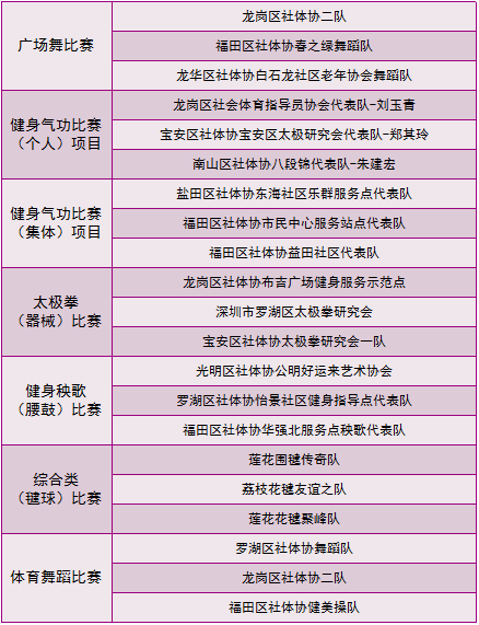深圳市2018年第二屆社會(huì)體育指導(dǎo)員技能交流展示大賽各單項(xiàng)比賽一等獎(jiǎng)獲獎(jiǎng)名單
