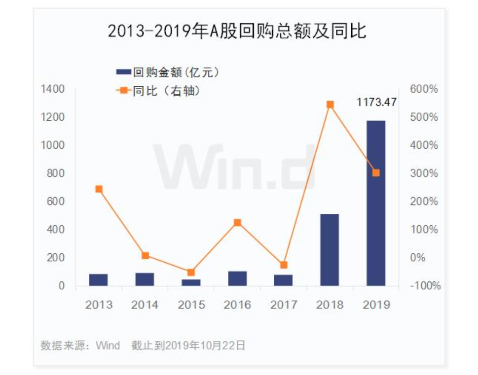 2、A股回購數(shù)量和金額呈爆發(fā)式增長:截止10月22日,2019年兩市已有974家公司實施了1397筆回購,總回購金額已達1173.47億元,較去年同期增幅超過3倍。