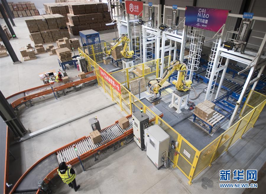 ??? 近日,在菜鳥(niǎo)網(wǎng)絡(luò)武漢黃陂物流倉(cāng)內(nèi),一組機(jī)械臂在進(jìn)行搬運(yùn)作業(yè)。近日,菜鳥(niǎo)網(wǎng)絡(luò)在湖北武漢黃陂物流倉(cāng)庫(kù)啟用智能機(jī)械臂來(lái)搬運(yùn)商品。據(jù)介紹,每組機(jī)械臂一個(gè)小時(shí)能搬運(yùn)1000件商品,可以24小時(shí)不間斷作業(yè)。這些機(jī)械臂的投入,有助于緩解高峰期貨物處理壓力,提高發(fā)貨速度,被工程師親切地稱為“麒麟臂”。新華社記者肖藝九攝