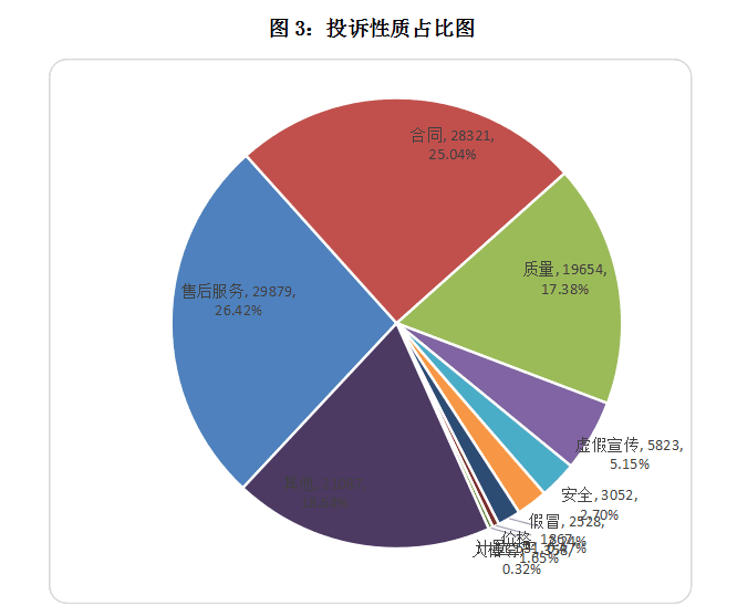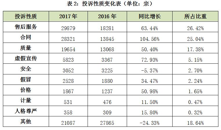 2017年,消費(fèi)者反映最突出的投訴性質(zhì)分別是售后服務(wù)29879宗,占26.42%;合同28321宗,占25.04%;質(zhì)量19654宗,占17.38%;三大性質(zhì)類別的投訴占比都超過(guò)了15%。