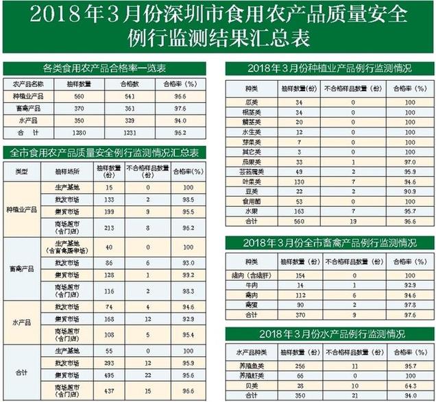 根據(jù)《市食品藥品監(jiān)管局關(guān)于印發(fā)2018年深圳市食用農(nóng)產(chǎn)品質(zhì)量安全例行監(jiān)測(cè)方案的通知》(深食藥〔2017〕255號(hào)),深圳市食品藥品監(jiān)督管理局3月份在全市范圍內(nèi)的64個(gè)食用農(nóng)產(chǎn)品生產(chǎn)、經(jīng)營(yíng)場(chǎng)所抽檢食用農(nóng)產(chǎn)品1280份,其中種植業(yè)產(chǎn)品560份,19份不合格;畜禽類產(chǎn)品370份,9份不合格;水產(chǎn)品350份,21份不合格。檢測(cè)不合格的產(chǎn)品均已實(shí)施了后續(xù)處理。詳情請(qǐng)登錄深圳市市場(chǎng)和質(zhì)量監(jiān)督管理委員會(huì)網(wǎng)站查詢,網(wǎng)址http://www.szaic.gov.cn/。