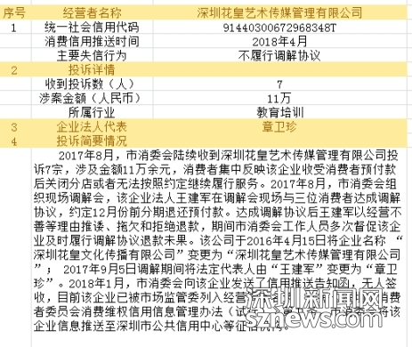 2017年8月,市消委會(huì)陸續(xù)收到深圳花皇藝術(shù)傳媒管理有限公司投訴7宗,涉及金額11萬(wàn)余元,消費(fèi)者集中反映該企業(yè)收受消費(fèi)者預(yù)付款后關(guān)閉分店或者無(wú)法按照約定繼續(xù)履行服務(wù)。2017年8月,市消委會(huì)組織現(xiàn)場(chǎng)調(diào)解會(huì),該企業(yè)法人王建軍在調(diào)解會(huì)現(xiàn)場(chǎng)與三位消費(fèi)者達(dá)成調(diào)解協(xié)議,約定12月份前分期退還預(yù)付款。達(dá)成調(diào)解協(xié)議后王建軍以經(jīng)營(yíng)不善等理由推諉、拖欠和拒絕退款,期間市消委會(huì)工作人員多次督促該企業(yè)及時(shí)履行調(diào)解協(xié)議退款未果。該公司于2016年4月15日將企業(yè)名稱 “深圳花皇文化傳播有限公司”變更為“深圳花皇藝術(shù)傳媒管理有限公司”; 2017年9月5日調(diào)解期間將法定代表人由“王建軍”變更為“章衛(wèi)珍”。2018年1月,市消委會(huì)向該企業(yè)發(fā)送了信用推送告知函,無(wú)人簽收,目前該企業(yè)已被市場(chǎng)監(jiān)管委列入經(jīng)營(yíng)異常名錄。依據(jù)《深圳市消費(fèi)者委員會(huì)消費(fèi)維權(quán)信用信息管理辦法(試行)》第九條,市消委會(huì)將該企業(yè)信息推送至深圳市公共信用中心等征信機(jī)構(gòu)。該企業(yè)雖然變更了公司名稱和法定代表人等公司信息,但仍需承擔(dān)原企業(yè)未履行的法定或約定義務(wù)。