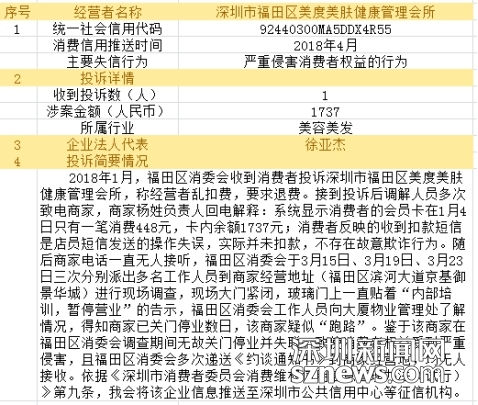 2018年1月,福田區(qū)消委會(huì)收到消費(fèi)者投訴深圳市福田區(qū)美度美膚健康管理會(huì)所,稱經(jīng)營(yíng)者亂扣費(fèi),要求退回余額(會(huì)員卡余額1737元)。接到投訴后調(diào)解人員多次致電商家,商家楊姓負(fù)責(zé)人回電解釋:系統(tǒng)顯示消費(fèi)者的會(huì)員卡在1月4日只有一筆消費(fèi)448元,卡內(nèi)余額1737元;消費(fèi)者反映的收到扣款短信是店員短信發(fā)送的操作失誤,實(shí)際并未扣款,不存在故意欺詐行為。隨后商家電話一直無(wú)人接聽(tīng),福田區(qū)消委會(huì)于3月15日、3月19日、3月23日三次分別派出多名工作人員到商家經(jīng)營(yíng)地址(福田區(qū)濱河大道京基御景華城)進(jìn)行現(xiàn)場(chǎng)調(diào)查,現(xiàn)場(chǎng)大門緊閉,玻璃門上一直貼著“內(nèi)部培訓(xùn),暫停營(yíng)業(yè)”的告示,福田區(qū)消委會(huì)工作人員向大廈物業(yè)管理處了解情況,得知商家已關(guān)門停業(yè)數(shù)日,該商家疑似“跑路”。鑒于該商家在福田區(qū)消委會(huì)調(diào)查期間無(wú)故關(guān)門停業(yè)并失聯(lián),致使消費(fèi)者權(quán)益受到嚴(yán)重侵害,且福田區(qū)消委會(huì)多次遞送《約談通知書》到商家經(jīng)營(yíng)地,均無(wú)人接收。依據(jù)《深圳市消費(fèi)者委員會(huì)消費(fèi)維權(quán)信用信息管理辦法(試行)》第九條,我會(huì)將該企業(yè)信息推送至深圳市公共信用中心等征信機(jī)構(gòu)。