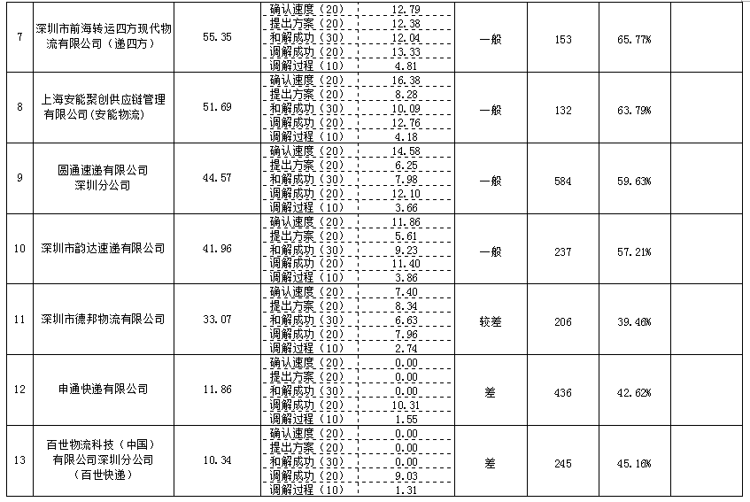 據(jù)市消委會數(shù)據(jù)顯示,深圳市快遞物流行業(yè)消費維權(quán)信用指數(shù)排名前三的企業(yè)分別是:中國郵政速遞物流股份有限公司深圳分公司,消費維權(quán)信用指數(shù)89.17,信用等級優(yōu)秀;深圳海帶寶網(wǎng)絡(luò)科技有限公司,消費維權(quán)信用指數(shù)80.10,信用等級優(yōu)秀;順豐速運有限公司,消費維權(quán)信用指數(shù)72.55,信用等級良好。本次排名靠后的企業(yè)是:深圳市德邦物流有限公司,消費維權(quán)信用指數(shù)33.07,信用等級較差;申通快遞有限公司,消費維權(quán)信用指數(shù)11.86,信用等級差;百世物流科技(中國)有限公司深圳分公司,消費維權(quán)信用指數(shù)10.34,信用等級差,排名最后。