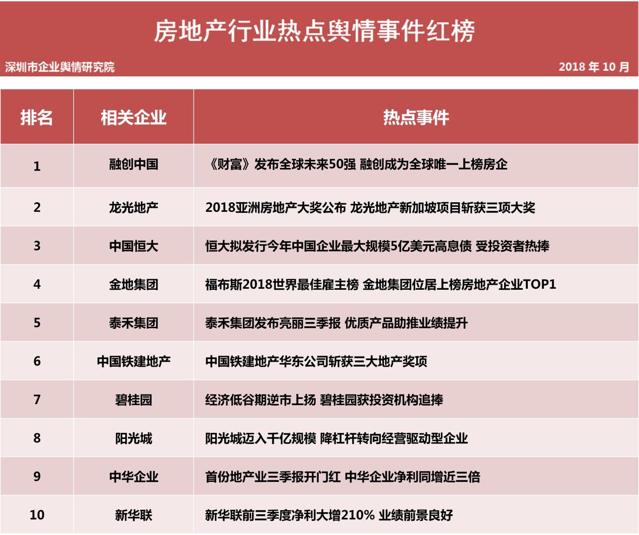 本榜單主要通過計算機系統(tǒng)對輿情數(shù)據(jù)的自動采集、整理和分析,結(jié)合輿情分析師的篩選和研判,對2018年10月1日至10月31日這一時段內(nèi)房地產(chǎn)領域的熱點輿情事件作出綜合評估,主要評估指標包含新聞報道指數(shù)、微博擴散指數(shù)、論壇參與指數(shù)、境外炒作指數(shù)。