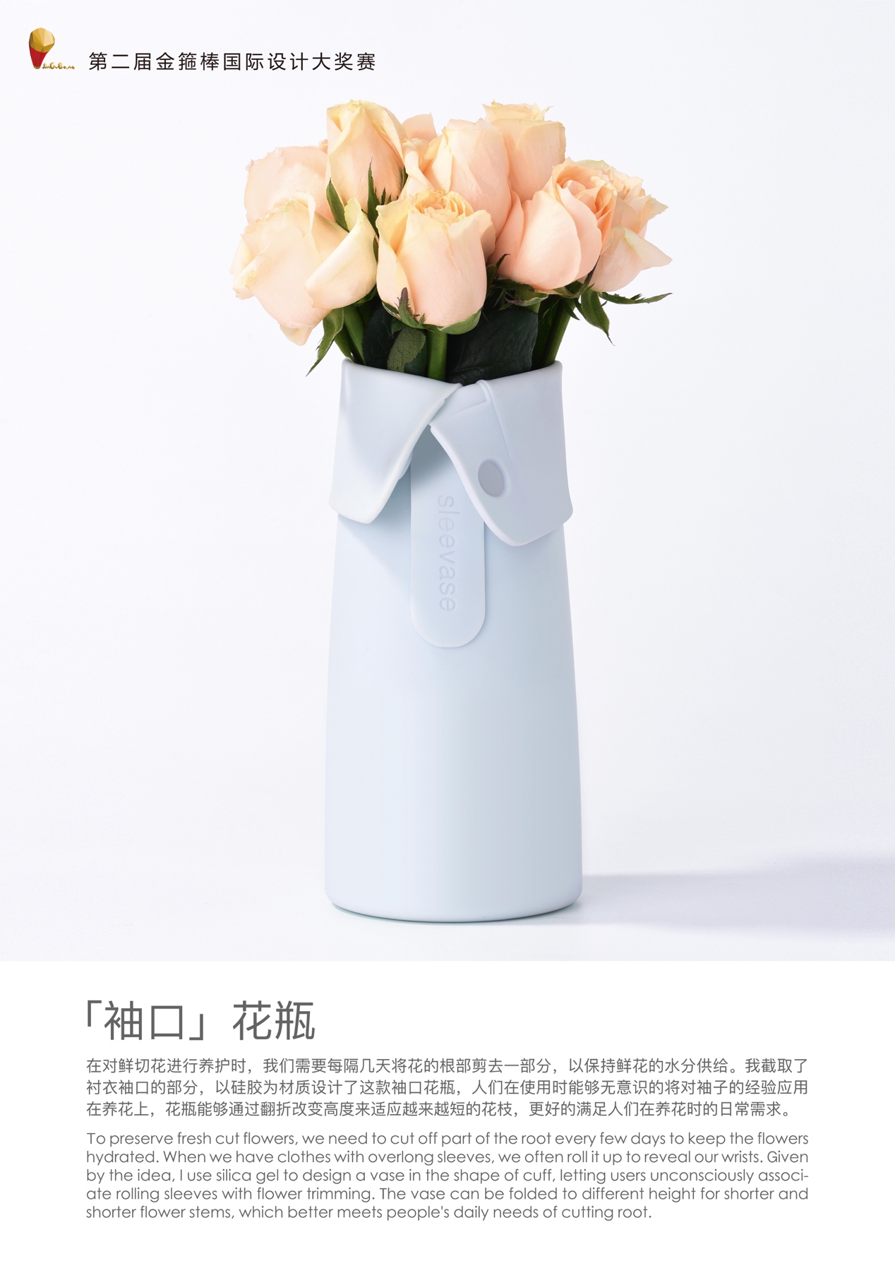 這件作品將衣袖造型應(yīng)用于植物養(yǎng)護(hù),用戶可以通過(guò)翻折來(lái)改變花瓶高度,從而適應(yīng)不同長(zhǎng)短的花枝。設(shè)計(jì)師抓住了人們?nèi)粘I钪蟹浅<?xì)微的一個(gè)痛點(diǎn),進(jìn)行了大膽的設(shè)計(jì),作品本身簡(jiǎn)約且意趣盎然,同時(shí)具有很強(qiáng)的產(chǎn)業(yè)化可行性,因而也獲得了評(píng)委們的芳心。