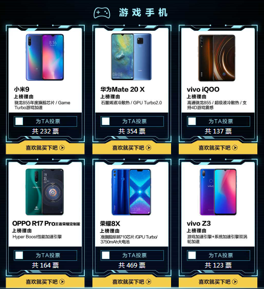 而游戲手機(jī)候選產(chǎn)品則包括:小米9、華為Mate20 X、vivo iQOO、OPPO R17 Pro王者榮耀定制版、榮耀8X、vivo Z3六強(qiáng)爭霸,同樣截至3月12日,第一天的投票中,榮耀8X脫穎而出,暫時(shí)領(lǐng)先。