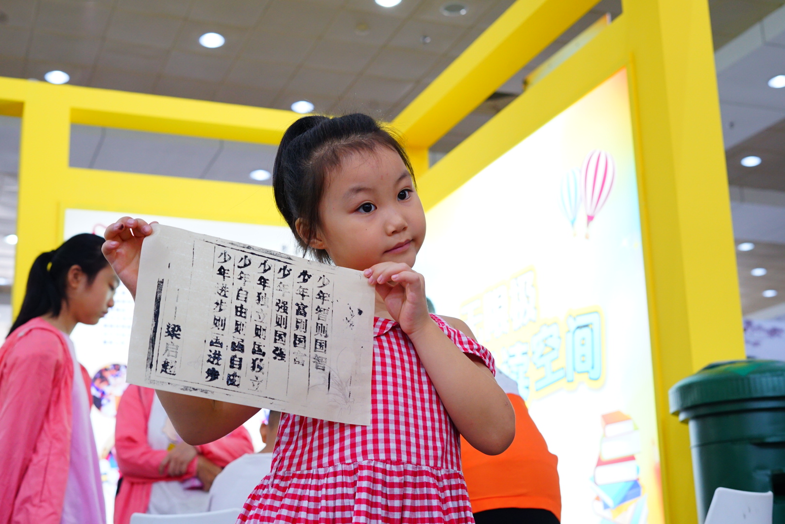 有了一系列視覺沖擊,現(xiàn)場還鼓勵大家動動手,“活字印刷”區(qū)和“手工布書”體驗區(qū)也是不容錯過。體驗涂墨、拓壓等工序,活字印刷術(shù)聽就聽得多了,小朋友見還是第一次見,還有機(jī)會親自體驗一番,感受濃濃書香氛圍。印刷的內(nèi)容節(jié)選自江門籍思想家、教育家梁啟超的愛國散文《少年中國說》。