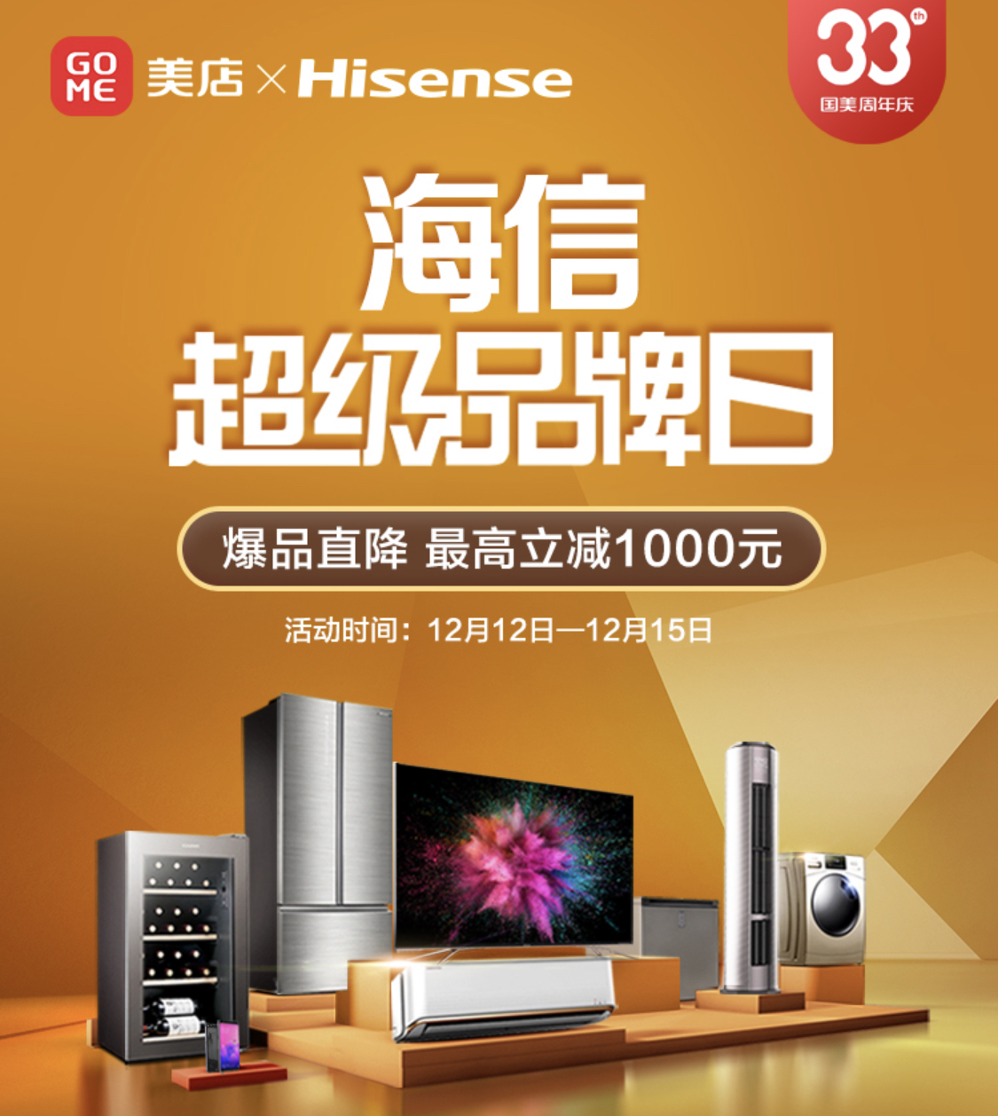 除以上產(chǎn)品外,還有數(shù)十款海信產(chǎn)品大幅度讓利,非常劃算。12月12日至15日期間,國美美店超級品牌日等你來。此外,用戶在國美門店參與套購滿額返,還將獲得大額優(yōu)惠券,第二單可實現(xiàn)半價購買,國美33周年,低價好物帶回家。(常軍平)