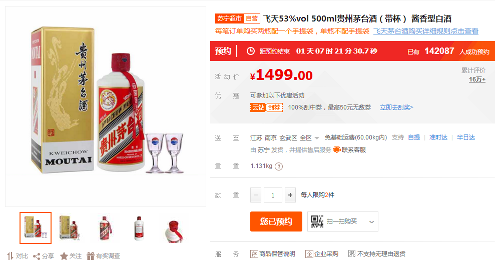 買年貨上蘇寧,買好酒上蘇寧。要說年貨節(jié)期間,蘇寧超市酒水類目的明星產(chǎn)品,還要屬1499元的飛天茅臺(tái)酒。年貨節(jié)期間,蘇寧已經(jīng)啟動(dòng)了多輪的飛天茅臺(tái)酒的預(yù)約搶購,而1月10日即將迎來新一輪的搶購。截至1月8日上午10點(diǎn)多,已經(jīng)有超過14萬實(shí)名認(rèn)證super會(huì)員參與了本次預(yù)約。