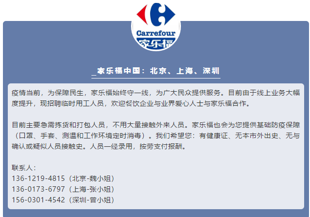 此外,家樂福還向全社會(huì)發(fā)出召集,以北京、上海、深圳為重點(diǎn)城市,希望社會(huì)暫時(shí)性歇業(yè)人員能夠前來(lái)上崗,主要工作職責(zé)為線上業(yè)務(wù)的揀貨、打包,不用大量接觸外來(lái)人員。家樂福將提供快速上崗培訓(xùn),包括個(gè)人安全衛(wèi)生和防護(hù)、顧客服務(wù)和崗位技能培訓(xùn),以及基礎(chǔ)防疫保障。