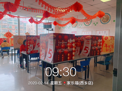 蘇寧家樂(lè)福還安排了保潔員每天對(duì)員工餐廳按三餐進(jìn)行清潔,使用稀釋的84消毒液浸泡抹布對(duì)桌椅進(jìn)行擦拭。其次,在餐廳放置免洗消毒凝膠,供員工用餐前清潔使用。再次,要求員工分時(shí)段用餐,自帶餐盒餐具盛飯;每個(gè)人在餐廳內(nèi)用餐是也要與他人保持一定距離,并用簡(jiǎn)易卡板隔開(kāi)。