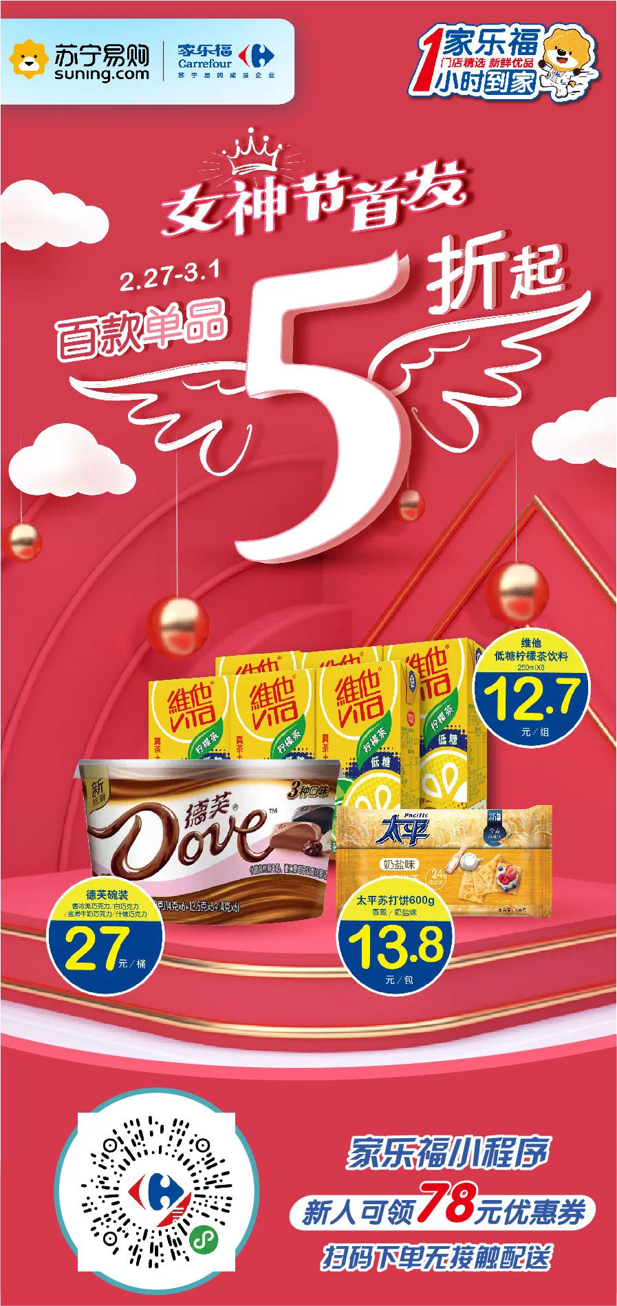 此外,還有上百款5折好物,即刻搶起來!德芙巧克力27元/桶、維他低糖檸檬茶12.7元/組,太平蘇打餅600g裝13.8元/包。家樂福小程序無接觸配送,宅家輕松購!