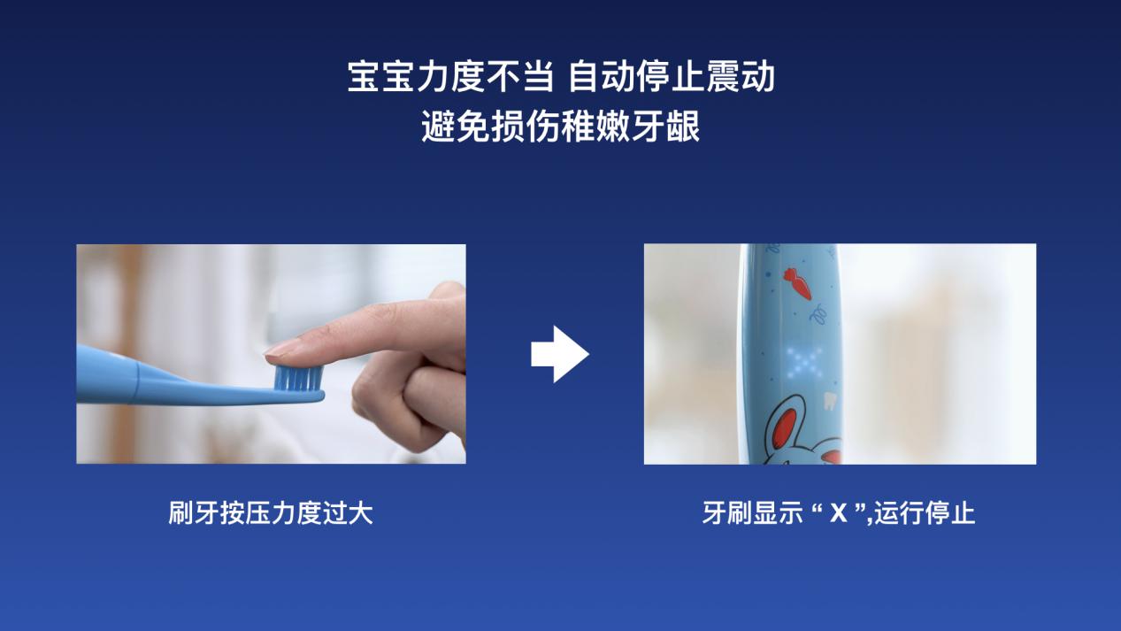S7000K智能音樂兒童電動牙刷還支持自動過壓降頻保護,當孩子在刷牙力度過大時,該功能就會啟動,自動停止振動,屏幕LED還會顯示出X型警告,保護孩子稚嫩的牙齦及牙釉質。