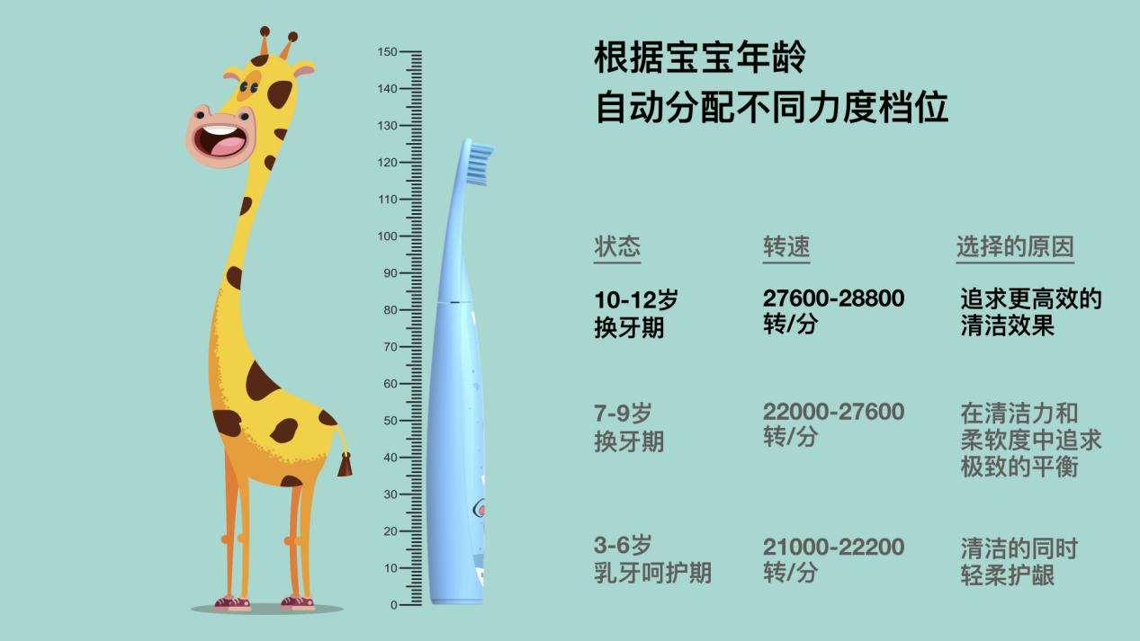 根據(jù)孩子的乳牙期、換牙期以及相應年齡段特點,S7000K可以自動分配不同的轉速力度檔位功能,分階呵護,讓孩子刷牙放心無憂。