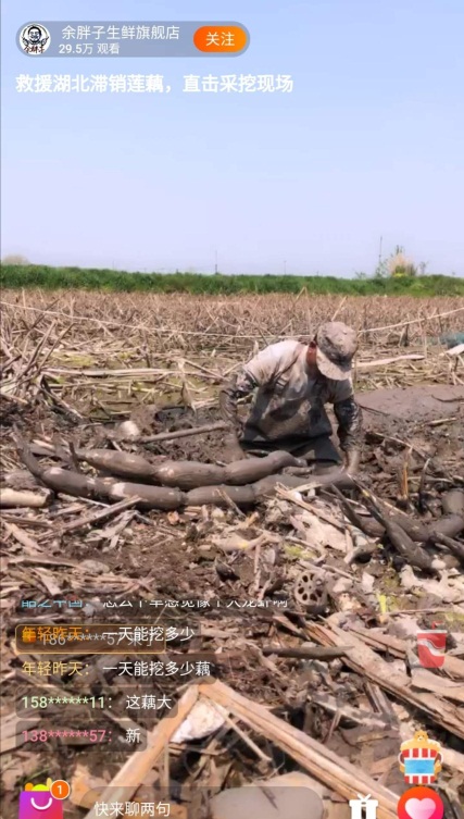 除了湖北的縣長、市長外,普通的湖北商戶不甘落后。8日上午,荊州洪湖的陽光明媚,“余胖子生鮮旗艦店”的店主便打開手機(jī)接通了直播,樸實(shí)的農(nóng)民性格讓他面對鏡頭一時不知該說什么好,簡單問好后,他就轉(zhuǎn)身下了塘,開始從厚重的泥土里拔出一根根新鮮的蓮藕。有不少00后網(wǎng)友是第一次見到挖藕的過程,他們發(fā)現(xiàn)原來潔白爽口的大藕居然是從泥中挖出來的,“挖藕真的太不容易了,一個上午要泡在塘泥里?!?/p>