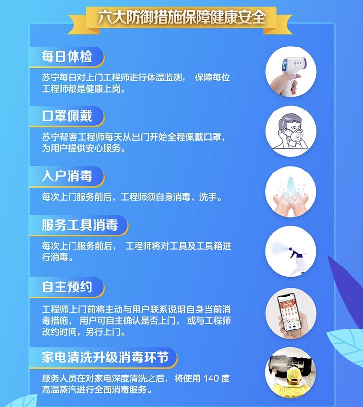 據(jù)了解,該承諾卡是蘇寧創(chuàng)建,主要承諾內(nèi)容包括服務(wù)前的體溫檢測(cè)、工具消毒、個(gè)人防護(hù);服務(wù)中的工程師全防護(hù)、工具不落地、與用戶保持安全距離;服務(wù)后的機(jī)器清潔、線上保修減少上門(mén)以及清理服務(wù)現(xiàn)場(chǎng)。