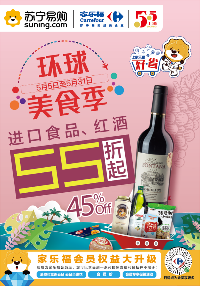 此外,家樂(lè)福方面還宣布將加大投入,全面支持上?!拔逦遒?gòu)物節(jié),全城打折季”。5月5日至31日,上海地區(qū)家樂(lè)福門店將開(kāi)啟“環(huán)球美食季”,精選來(lái)自法國(guó)、意大利、英國(guó)、西班牙、美國(guó)、加拿大、日本、韓國(guó)、馬來(lái)西亞等39個(gè)國(guó)家的350個(gè)品牌旗下共計(jì)3700多種進(jìn)口食品,與上海消費(fèi)者共襄盛舉。美食自然少不了美酒相伴,來(lái)自法國(guó)、意大利、西班牙、阿根廷、智利、澳洲等國(guó)家的70多個(gè)品牌旗下共計(jì)200多種進(jìn)口葡萄酒,也將悉數(shù)亮相全市家樂(lè)福門店?;顒?dòng)期間,進(jìn)口食品低至5.5折起,進(jìn)口紅酒買一送一。進(jìn)博會(huì)“同款”法國(guó)奧格斯汀系列葡萄酒也將首次參與促銷,葡萄酒愛(ài)好者不容錯(cuò)過(guò)。