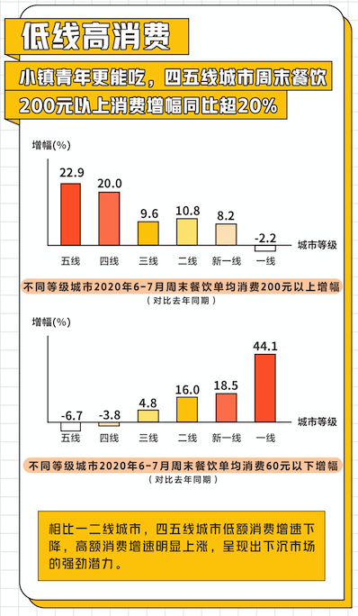 在周末消費趨勢中,《2020周末餐飲堂食消費趨勢洞察》還指出,相較于一二線城市,四五線等下沉市場高額消費增速明顯上漲,200元以上消費增幅超20%,顯示出強勁潛力。