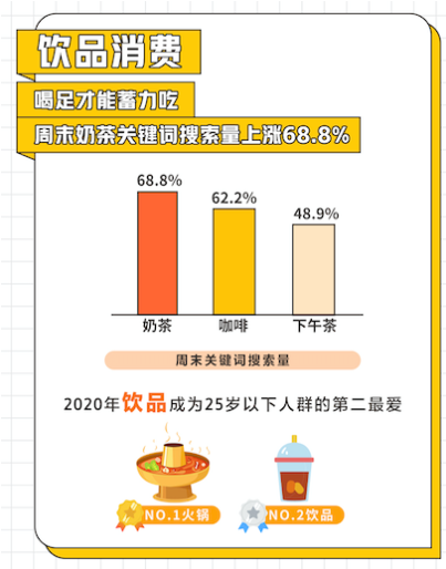 周末餐飲消費中,在美團點評,周末奶茶、咖啡關(guān)鍵詞搜索量上漲均超過60%,飲品更是成為25歲以下人群除火鍋之外的“心頭好”。