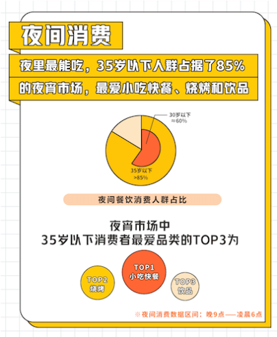 夜間消費在周末餐飲消費中備受年輕人青睞。《2020周末餐飲堂食消費趨勢洞察》顯示,35歲以下群體是周末夜間消費的主力,占比近九成,且最愛小吃快餐、燒烤和飲品三大品類。