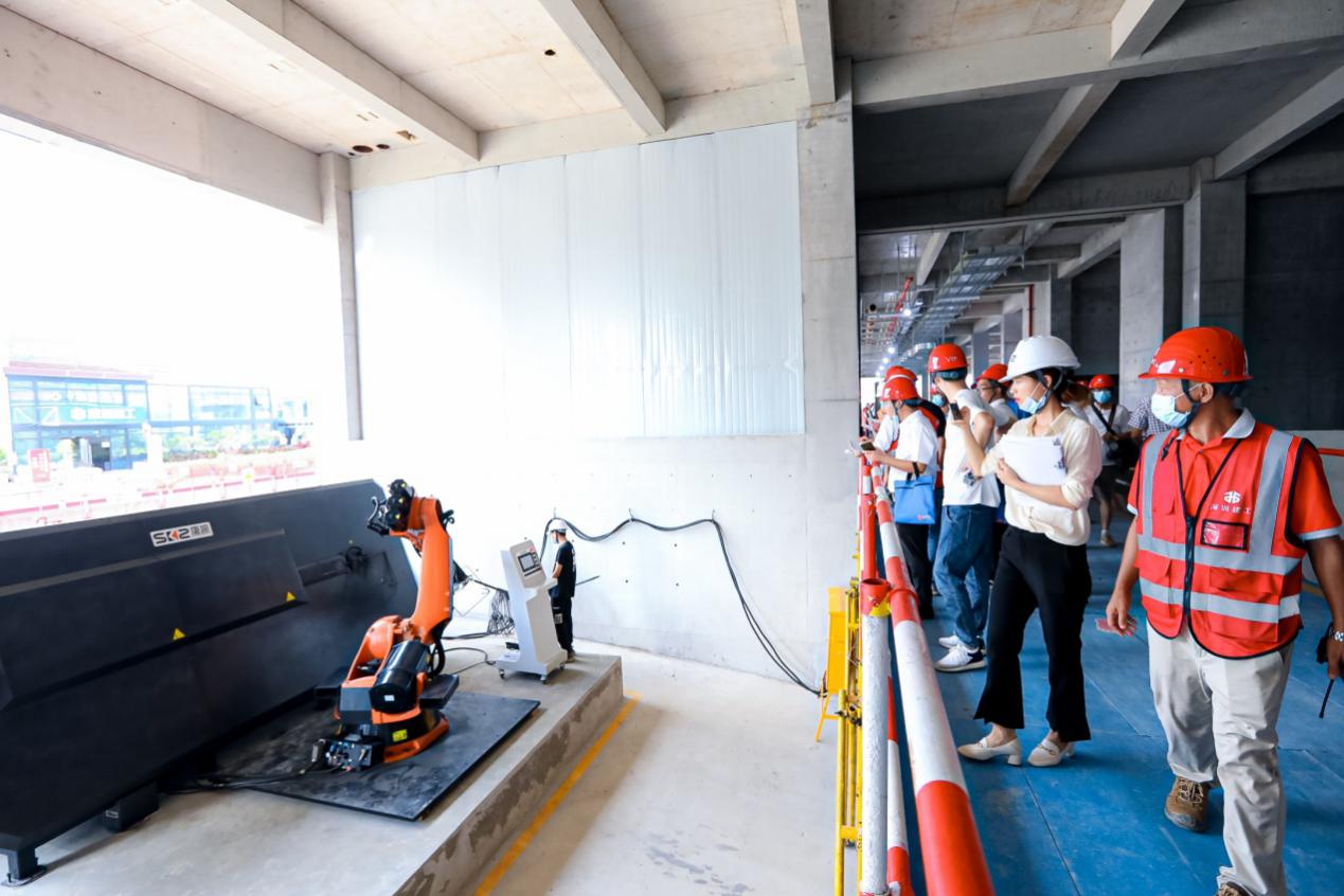 此次觀摩由“三中心一展區(qū)”構(gòu)成,即創(chuàng)魯班獎(jiǎng)優(yōu)秀工藝展示中心、科技創(chuàng)新中心、智能指揮中心和建筑內(nèi)展區(qū)。觀摩主要亮點(diǎn)有黨建引領(lǐng)高質(zhì)量發(fā)展、質(zhì)量管理體系與機(jī)制(參建方質(zhì)量管理體系、6σ管理、質(zhì)量管理標(biāo)準(zhǔn)化、精細(xì)化)、創(chuàng)魯班獎(jiǎng)優(yōu)秀工藝展示、市工務(wù)署優(yōu)秀工藝工法展示、工程質(zhì)量常見(jiàn)問(wèn)題治理(樣板引路)、智能建造推動(dòng)質(zhì)量提升(科技創(chuàng)新展示、抹灰機(jī)器人、實(shí)測(cè)實(shí)量機(jī)器人等智能建造設(shè)備實(shí)操演示、BIM技術(shù))、智慧工地展示(“e工務(wù)”APP應(yīng)用與推廣、智慧工地、智能指揮等)、6S管理等,通過(guò)現(xiàn)場(chǎng)講解員的介紹,使觀摩人員更加清晰且深入的了解相關(guān)內(nèi)容。