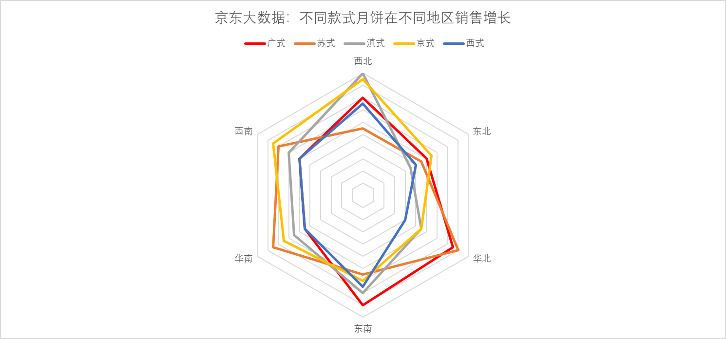 此前有報告顯示,消費者購買月餅渠道更多樣化,已然形成線上為主、線下為輔的趨勢。而隨著京東渠道的滲透、物流的下沉,很多偏遠(yuǎn)地區(qū)的線上消費比例也越來越大,比如西北地區(qū)消費者購買廣式和京式月餅的同比增長分別達(dá)160%和190%,線上銷售的方式打破了區(qū)域間的地理限制,跨區(qū)域嘗鮮成為潮流,而且促進(jìn)了全國各地節(jié)( chi)日( huo)的交流。