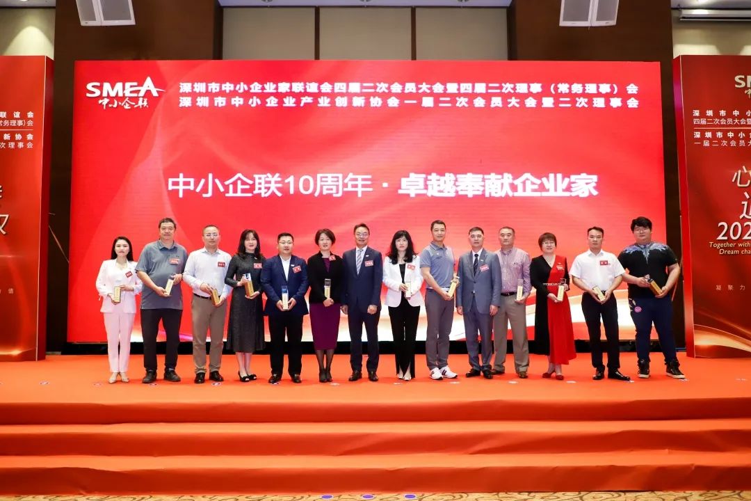 深圳市中小企業(yè)服務局副局長陳小林(左七)為獲得卓越貢獻獎的企業(yè)家頒獎
