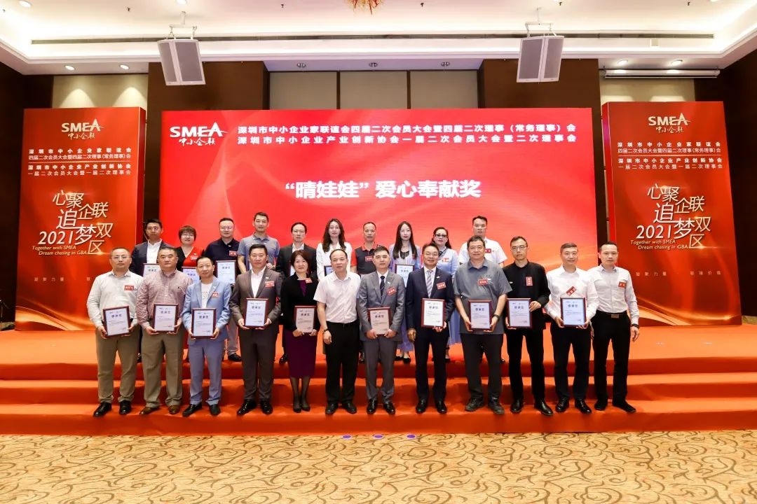 深圳市中小企業(yè)服務局副局長陳小林(一排左六)為獲得感恩相伴獎的企業(yè)家頒獎