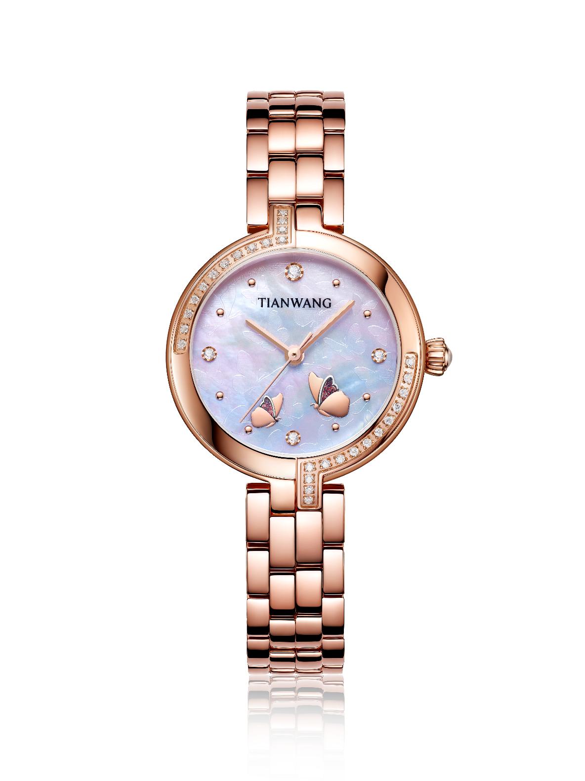 本次天天王表聯(lián)名 She’s飾品推出的新品腕表,就很好利用了蝴蝶這一元素,遠(yuǎn)觀貝母表盤下方兩只蝴蝶深情對望翩然起舞,細(xì)看竟還有滿盤的裸色印壓蝴蝶,著實精致巧妙,不同于《愛蓮說》中的“可遠(yuǎn)觀而不可褻玩焉,蝴蝶腕表可謂是兼具觀賞和把玩兩大功能,優(yōu)雅時尚又充滿浪漫色彩。