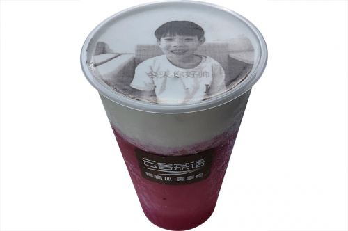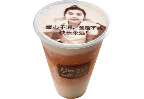 建議由孩子把自己或家人的照片加上一句話祝愿的話,作成圖片先保存到手機(jī)里。到店后,在云客茶語小程序上傳打印到奶茶上。整個制作過程約10分鐘。