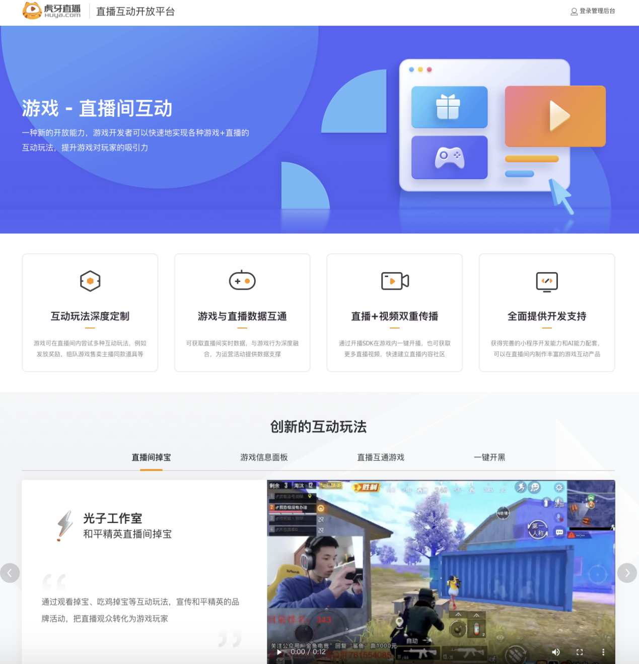 今年3月,虎牙直播互動開放平臺正式上線。通過開放平臺提供的七大核心開放能力,游戲廠商可以獲得完善的小程序開發(fā)能力和AI能力配套,快速實現(xiàn)各種“游戲+直播”的互動玩法。