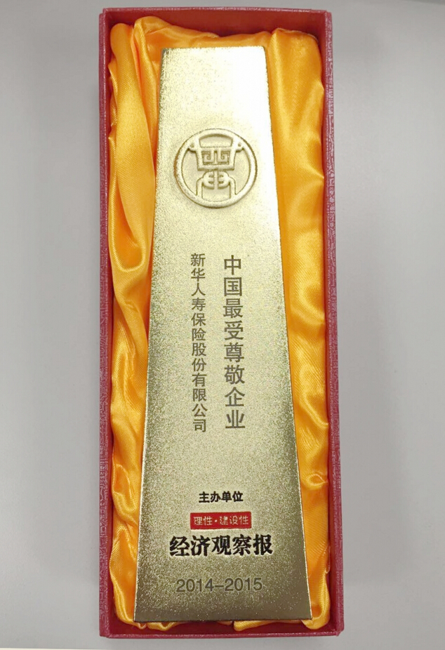 2015年7月,在經(jīng)濟(jì)觀察報(bào)主辦的2014-2015中國(guó)最受尊敬企業(yè)評(píng)選中,新華獲評(píng)“中國(guó)最受尊敬企業(yè)”獎(jiǎng)。中國(guó)綠色保險(xiǎn)最佳典范企業(yè)2015年8月,在經(jīng)濟(jì)參考報(bào)主辦的“2015中國(guó)綠色資本論壇暨中國(guó)綠色資本品牌榜”活動(dòng)中,新華保險(xiǎn)榮獲“中國(guó)綠色保險(xiǎn)最佳典范企業(yè)”。2015胡潤(rùn)品牌百?gòu)?qiáng)9月17日,胡潤(rùn)研究院發(fā)布《2015胡潤(rùn)品牌榜》顯示,新華保險(xiǎn)以120億元的品牌價(jià)值占據(jù)榜單第68名,首次進(jìn)入榜單前百?gòu)?qiáng),同比強(qiáng)勁上升51位。品牌價(jià)值漲幅高達(dá)287%,漲幅居金融業(yè)之首,且是唯一一家進(jìn)入增值品牌十強(qiáng)的金融企業(yè),顯示出新華保險(xiǎn)品牌實(shí)力的快速提升,以及公司綜合實(shí)力的顯著增強(qiáng)。
