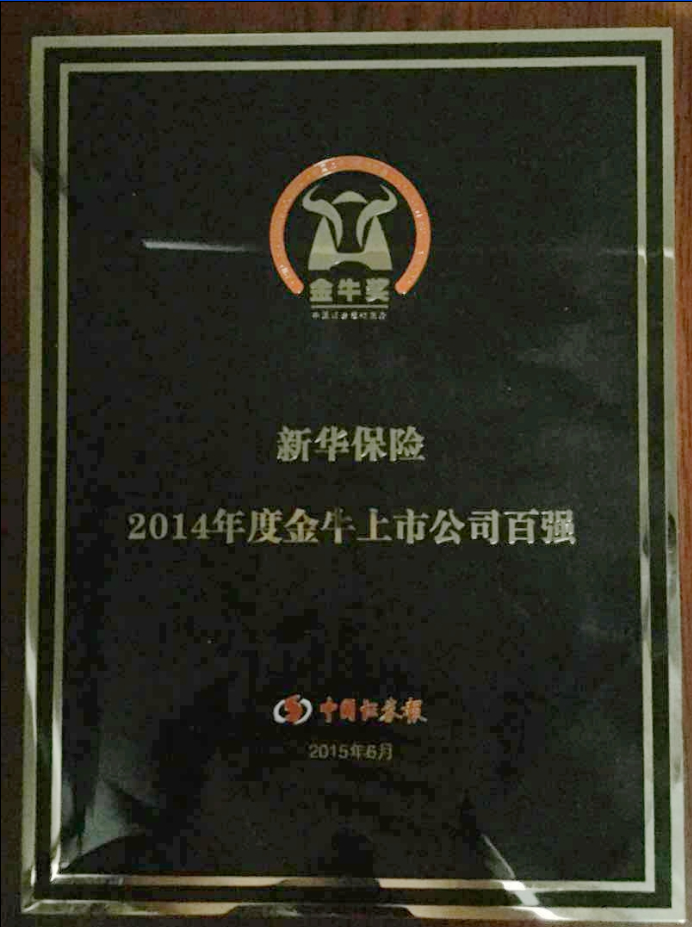 ?2015年6月,中國證券報(bào)第17屆(2014年度)上市公司金牛獎(jiǎng)隆重揭曉,新華保險(xiǎn)榮獲“金牛上市公司百強(qiáng)”獎(jiǎng)項(xiàng),這代表了資本市場以及社會(huì)各界對(duì)新華保險(xiǎn)在公司治理、信息披露、投資者關(guān)系等方面工作的高度認(rèn)可。